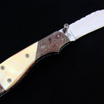 This extended tang knife features a Drop Point blade that is hollow ground from 154CM S/S. The blade and spine are fileworked with titanium liners that add colored filework. The handle slabs are Mother Of Pearl. The blade measures 2 x 3/4 x 1/8 with and overall length of 5 3/8.