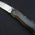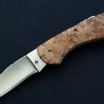 This blade is hollow ground from 154CM S/S. It has extended tang lockback construction with the handle slabs of Box Elder. The titanium liners are filworked and colored. The blade and spine are also fileworked. The blade measures 2 x 3/4 x 1/8 and 4 inch overall in length.