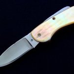 This knife features a 154CM S/S Clip Point blade that is hollow ground with titanium liners and colored filework, yellow lip pearl handle slabs, fileworked blade and spine with extended tang lock feature. The blade measures 2 x 3/4 x 1/8 with an overall length of 5 1/4.