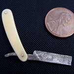 This mini replica of an old time razor features a Steve Schwerzer steel and is dressed with piano key ivory. 1 1/2" long closed.