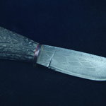 This is a small utility knife with a 3 billet composite. It sports a nickel twist core billet with a heavy etch. It is a convex ground 3 1/4" by 1/8". The knife measures 8" overall in length. Antler tine handle with cable Damascus guards and red stone inlay secured by a twisted stainless steel wire anchor. Red expansion spacers protects against thermal fractures in the handle material. It comes with a smooth leather pocket sheath that fits almost anywhere.