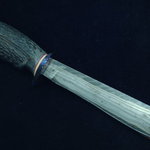This 3 billet composite striped cable Damascus blade is convex ground to 5 1/2" by 1/8" with blued/bronze cable Damascus guard (like midnight lightning bolts)and Jasper stone on the butt cap secured with twisted copper wire inlay that sets off a globe look on the end. A snake skin inlayed leather slip sheath completes this package.