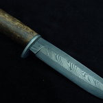 This knife spent almost a year on display in a museum in Houston Texas and returned to me with the nickname "The Fossil". This 5 billet composite Damascus blade with nickel twist cores was convex ground to 5" by .160", and then a heavy etched for contrast as well as texture. Mammoth ivory handle with cable Damascus guard and gold colored pins. The knife measures 8 1/2" overall in length. This knife is protected by a snake skin inlayed leather sheath equipped with pocket clip.