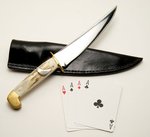 It is a 154CM stainless steel blade that has a fully fileworked spine with Mammoth bark ivory handle slabs and broze cable Damascus fittings in the front and rear. A smooth leather slip sheath comes with this beautiful knife.