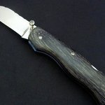 This blade is hollow ground from 154CM S/S. It has extended tang lockback construction with the handle slabs of Box Elder. The titanium liners are filworked and colored. The blade and spine are also fileworked. The blade measures 2 x 3/4 x 1/8 and 4 inch overall in length.