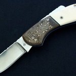 Mammoth ivory handled toggle release or French folder as some would say has a blade that is 2 3/4 by 1/8,is 154 CM stainless steel and hollow ground. It has a fully fileworked blade, spine and titanium liners with colored filework. This knife is either right or left handed with 4 thumb bobs. This knife was made in the "Producing Lockback Folders" DVD by Gene Osborn and produced by Center Cross Instructional Videoâ
