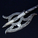 With cable Damascus forged by Kermit Laurent, this Cinquedea (five finger) sword features a pearl handle with brass and sterling silver pins and guard. This knife comes with a leather sheath. 4" long